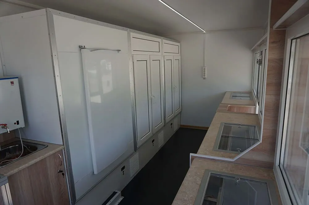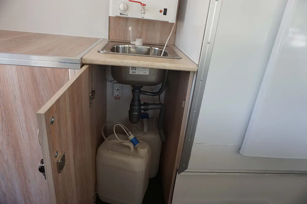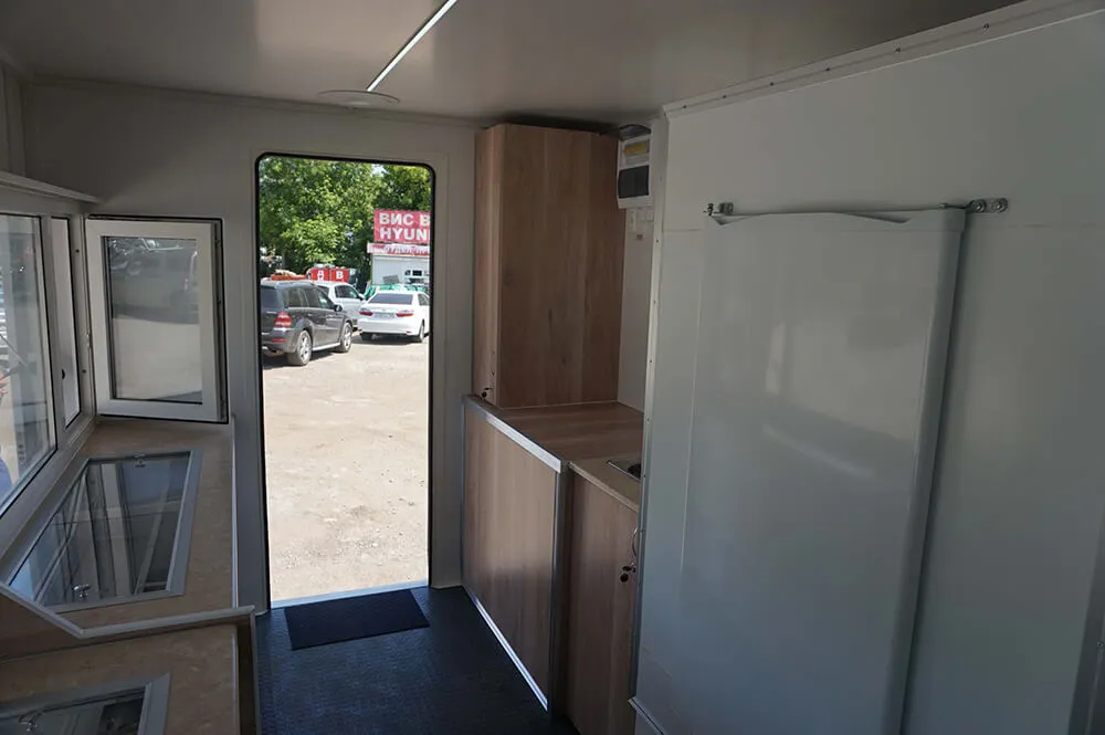 Внутренние размеры фургона 4700х2080х2030 мм или могут быть увеличены. Передвижной магазин представляет собой шасси с автолавкой, которая включает в себя удобный холодильный шкаф с витриной и гардеробный шкаф с дверью. В ДЖАК 80 предусмотрено автономное водоснабжение.